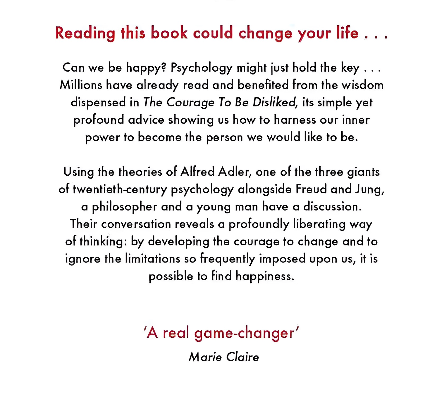 Millions have already benefited from the wisdom dispensed in The Courage to Be Disliked, its simple yet profound advice showing us how to harness our inner power to become the person we would like to be.
